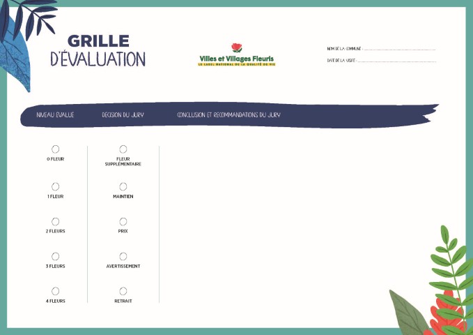 La grille d’évaluation, constituée de 68 critères concrets, est un référentiel unique et commun pour toutes les communes candidates, de la 1ère à la 4ème fleur. Elle garantit une évaluation homogène, objective et progressive en s’appuyant sur différents niveaux: inexistant, initié, réalisé, conforté. Elle permet ainsi de situer la commune dans son parcours de labellisation et de déterminer le nombre de Fleurs à attribuer.